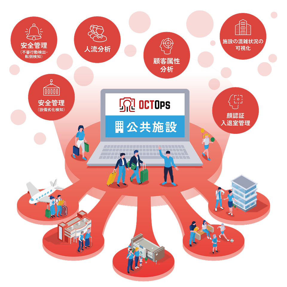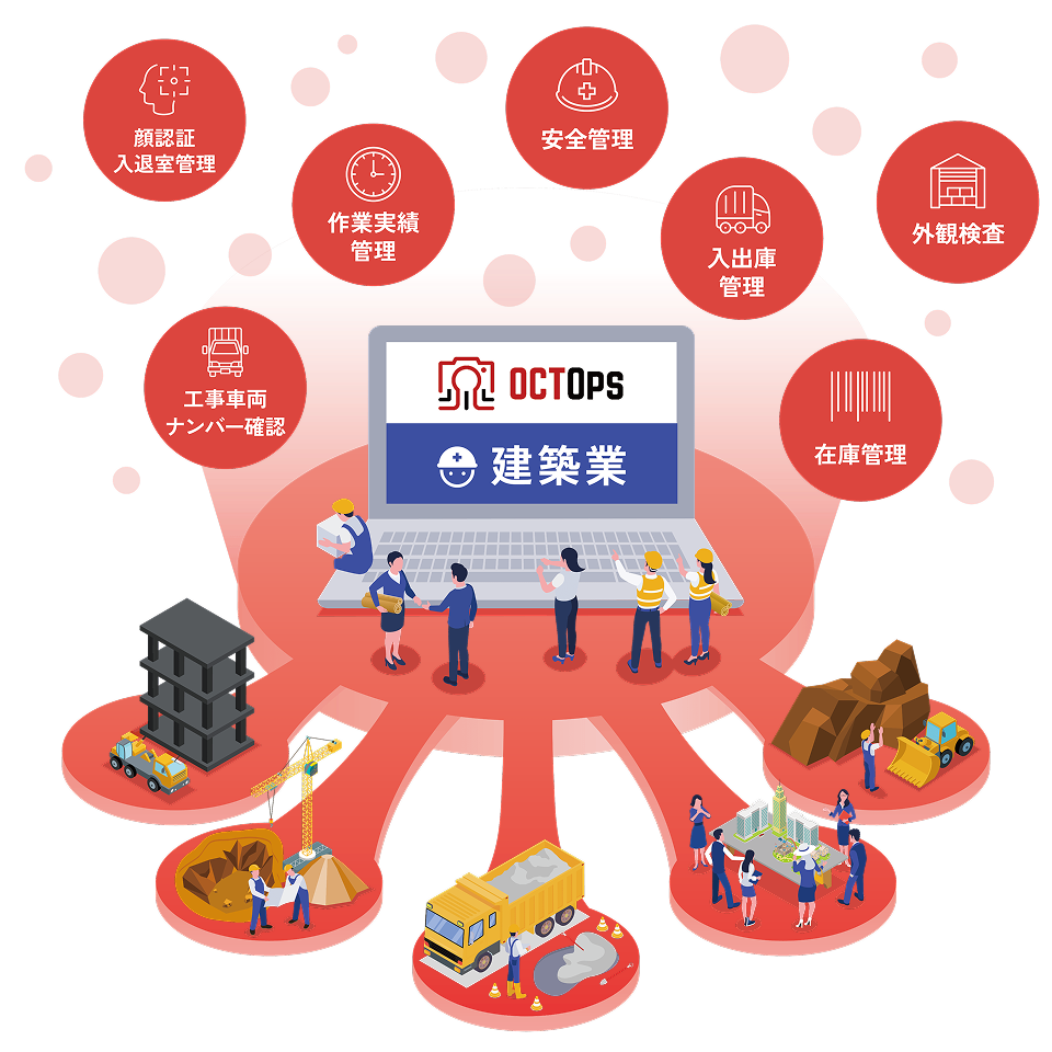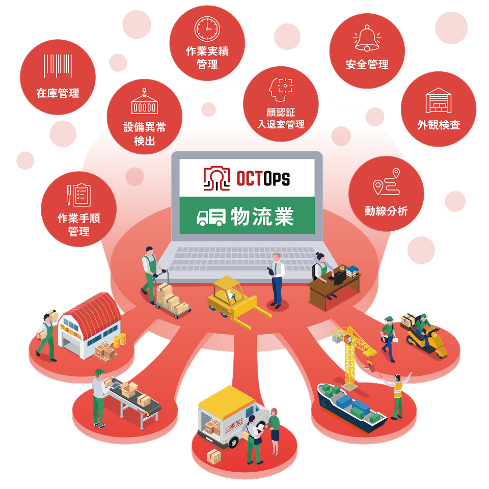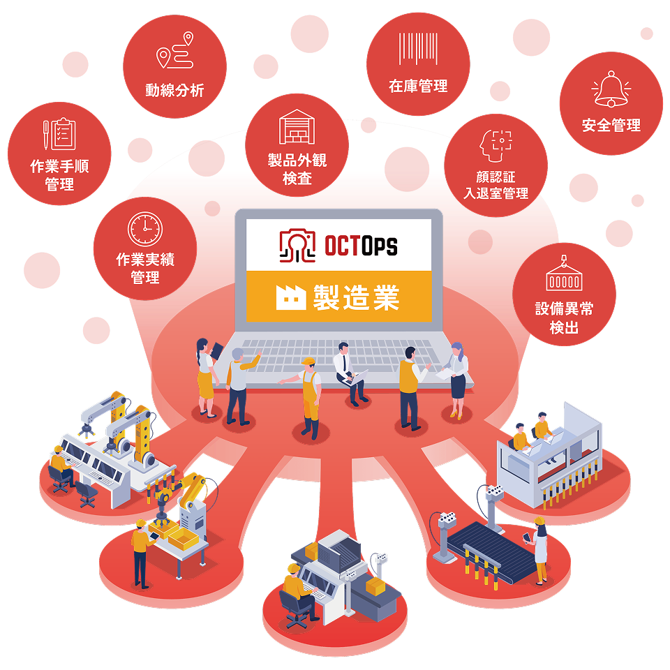 OCTOpsとは、工場等の現場の様々な場所に設置したカメラの映像から、 AIを通じて様々な情報を取得し、製造、建設、物流等の現場業務で 活用いただくためのソリューションです。