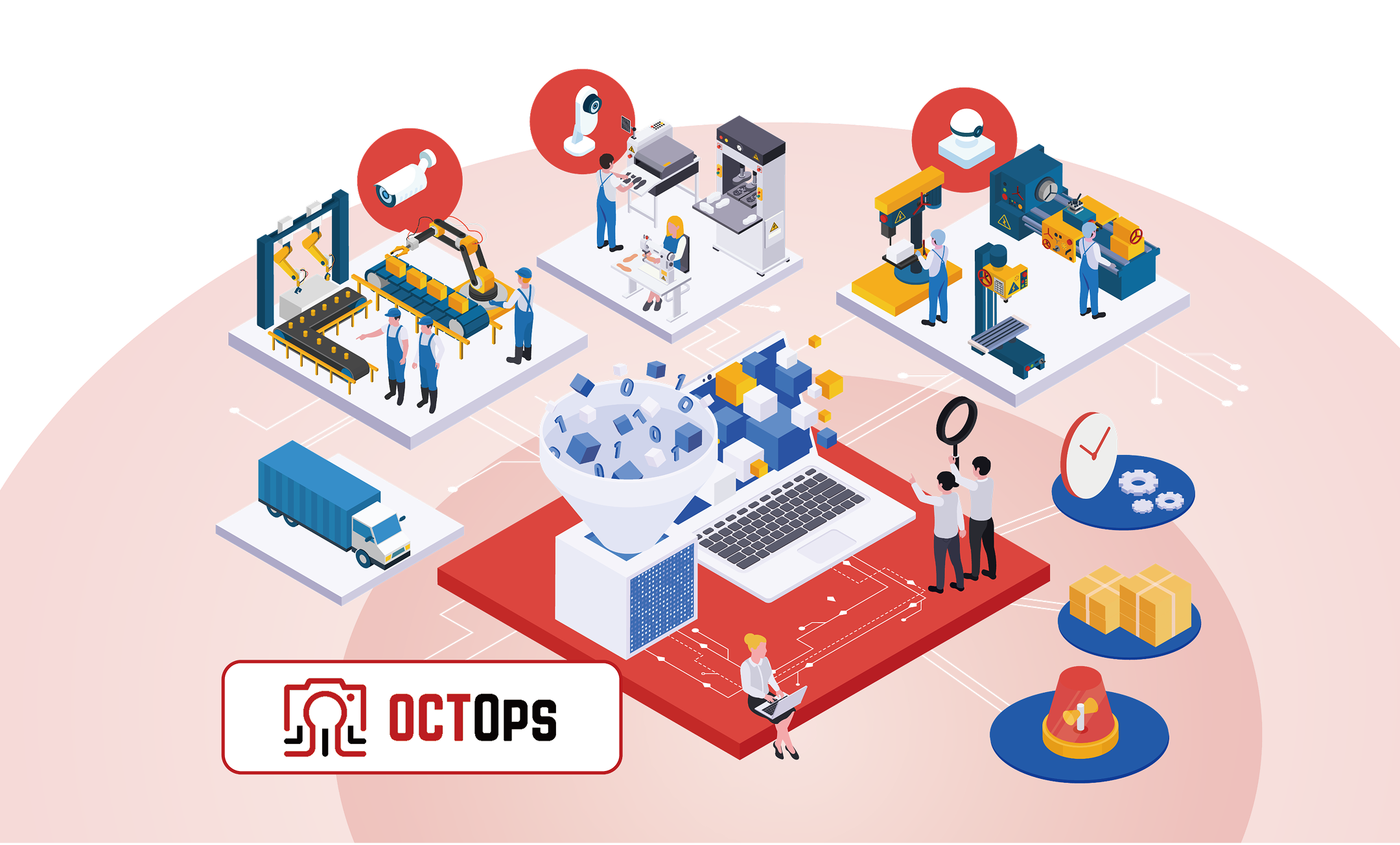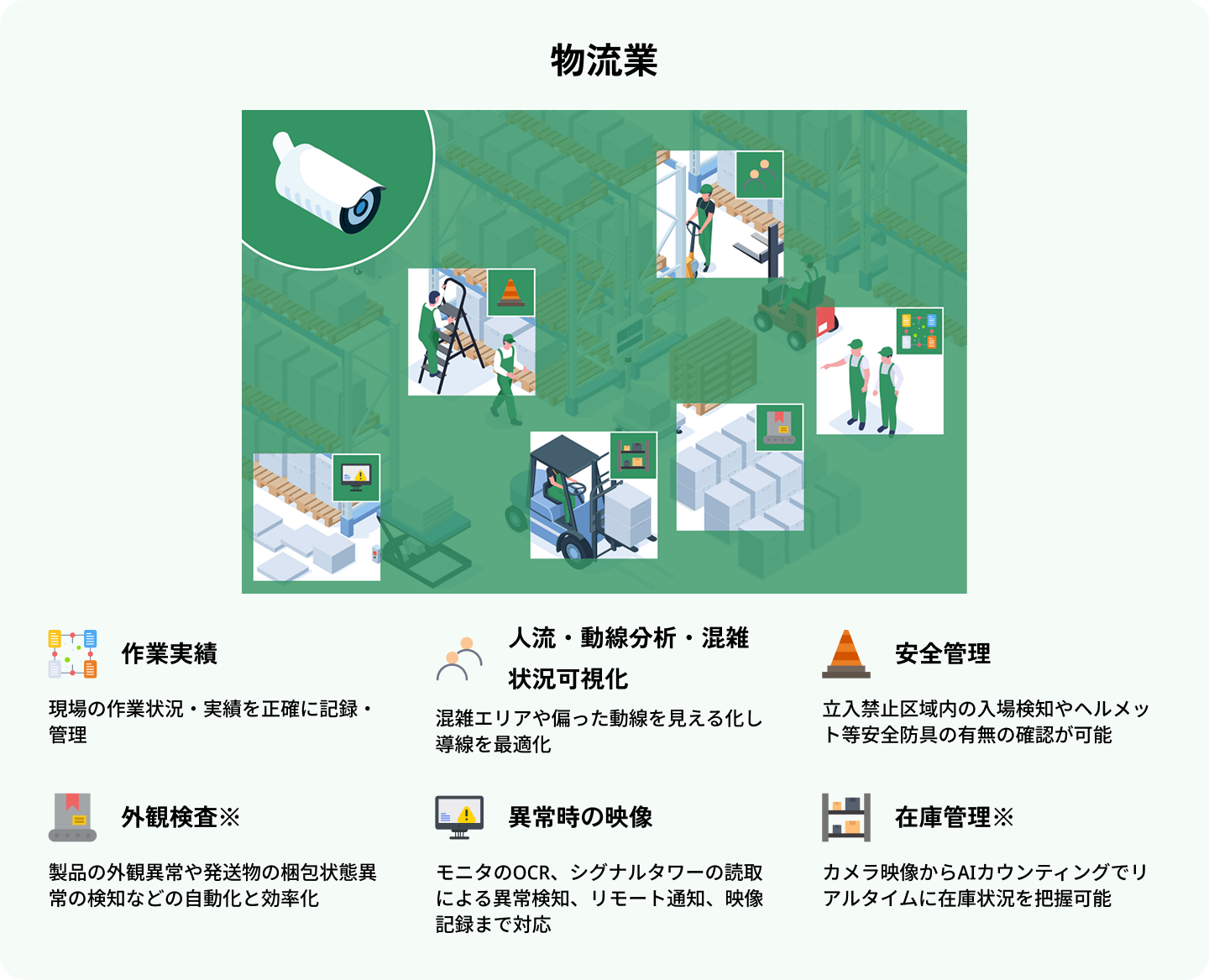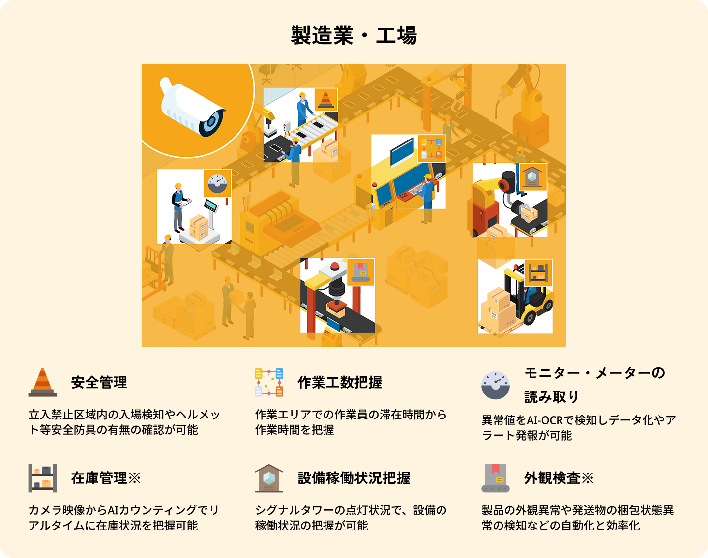 OCTOpsとは、工場等の現場の様々な場所に設置したカメラの映像から、 AIを通じて様々な情報を取得し、製造、建設、物流等の現場業務で 活用いただくためのソリューションです。
