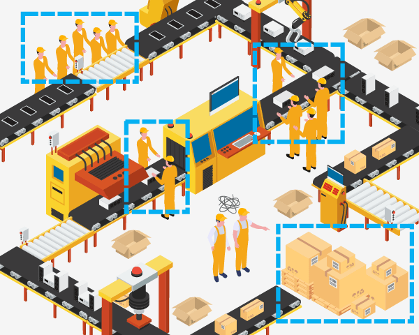 カメラ映像とAIにより、作業エリアにいる作業者の作業時間や機械の稼働状況を自動で認識。製品情報や工程情報を、PLCやARマーカー等を活用して同時に取得することで、製品ごと、工程ごとの実績情報の収集も可能になります。 生産管理システムへの実績情報の連携や、BIツールによる分析などにより、生産計画の効率化にもつながります。